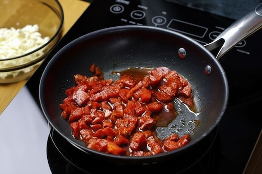 Chorizo oraz ser Mozzarella pokrój w małą kostkę. Na suchej patelni podsmażaj kiełbasę, potem ostudź i połącz z Mozzarellą.
