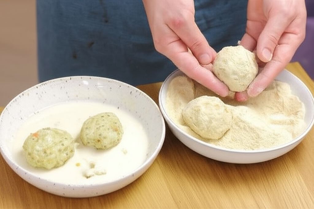 Przygotuj dwie miseczki: w pierwszej bułkę tartą, w drugiej mąkę wymieszaną z wodą. Uformowane kule obtocz najpierw w mieszance mąki z wodą, a potem w bułce tartej.