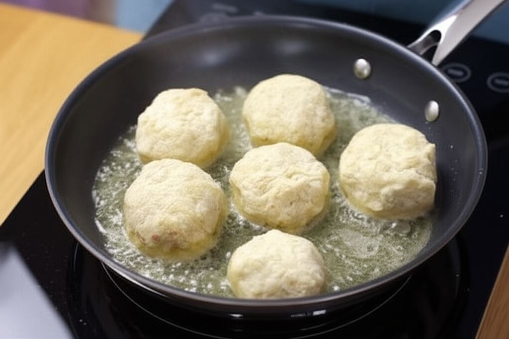 Smażyć panierowane kulki ryżowe na dobrze rozgrzanym tłuszczu do złotego koloru.