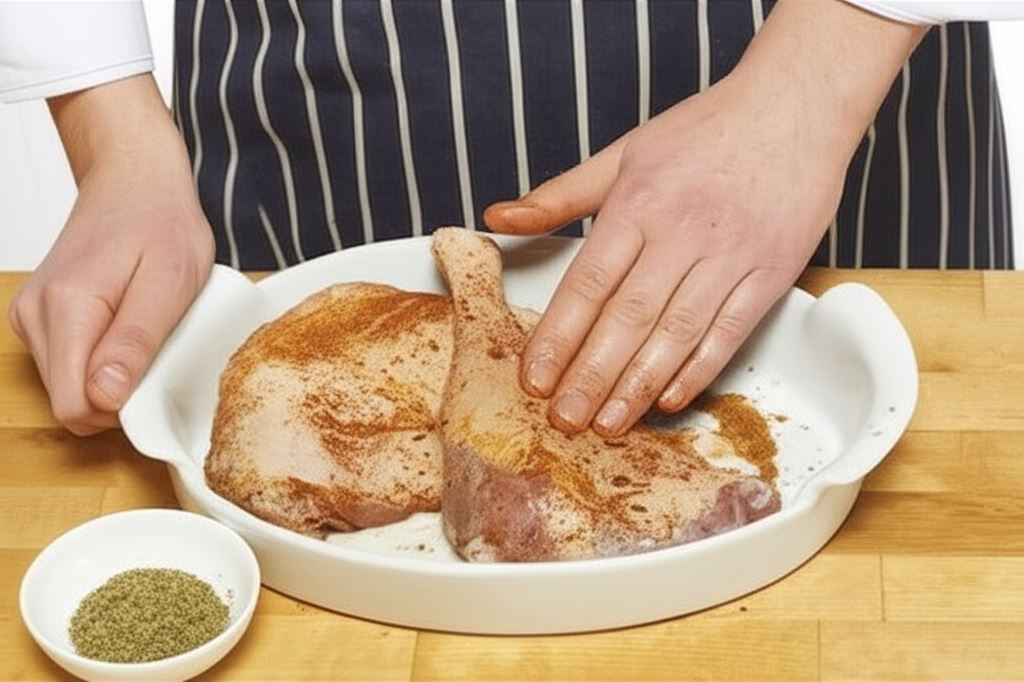 Nagrzej piekarnik do 180 °C. Natrzyj Przyprawę do kurczaka Knorr na udka z gęsi. Oprósz majerankiem. Włóż udka z gęsi do dużego naczynia do pieczenia i piecz przez 30 min. W międzyczasie pokrój jabłka na ćwiartki i wydrąż gniazda nasienne. Obtocz jabłka w cynamonie i gałce muszkatołowej.