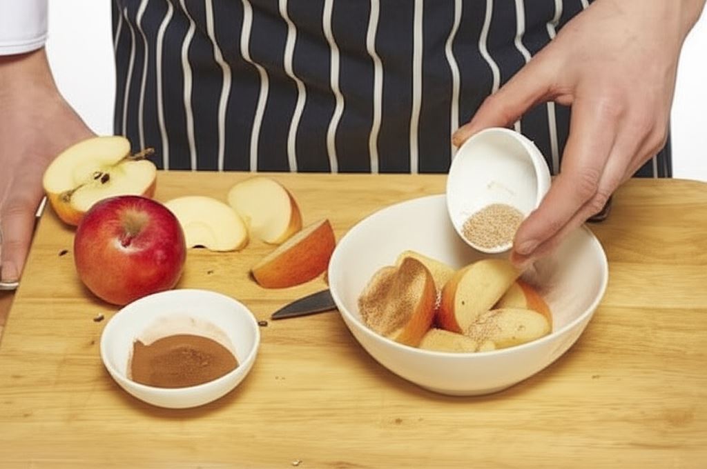 Wprowadź jabłka do pieczącego się dania po 30 minutach. Kontynuuj pieczenie przez następne 60 min. Wyjmij z piekarnika. Wyjmij udka. Nakryj folią aluminiową i odstaw na 10 min.