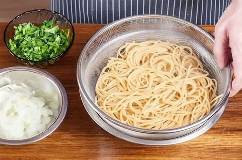 Makaron ugotuj na półtwardo w osolonej wodzie dodając łyżkę oliwy. Odcedź.