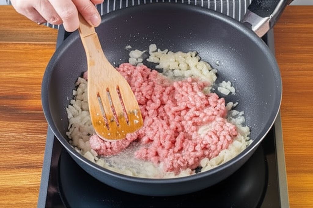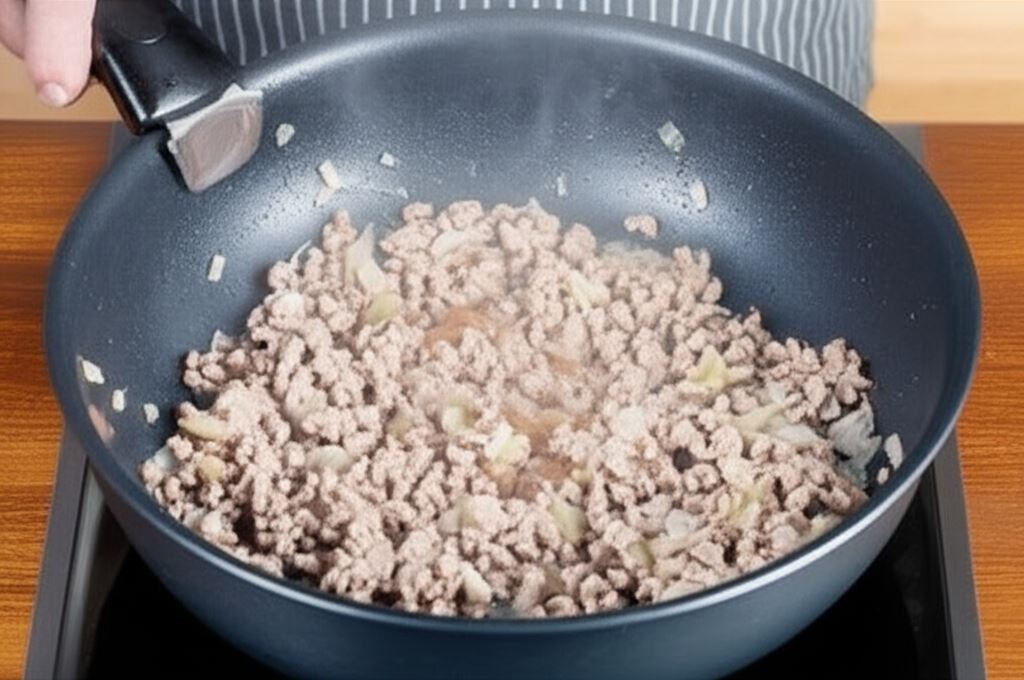 Zesmaż cebulę i czosnek na rozgrzanym tłuszczu, dorzuć mięso mielone i smaż wszystko razem.