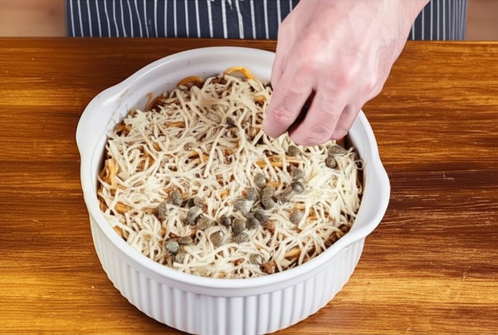 Ciepły makaron połącz z sosem i umieść w naczyniu żaroodpornym. Dodaj kapary i posyp tartym serem. Zapiekaj przykryty w piekarniku rozgrzanym do 180 st. C przez 35 minut. Na 10 minut przed końcem możesz zdjąć pokrywę, by wierzch się zrumienił.