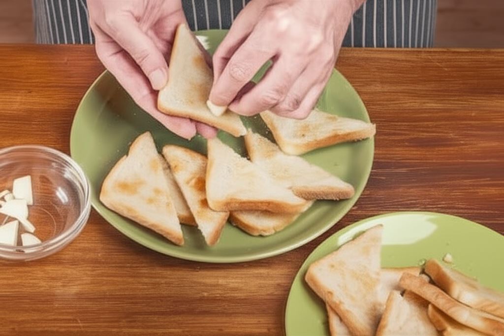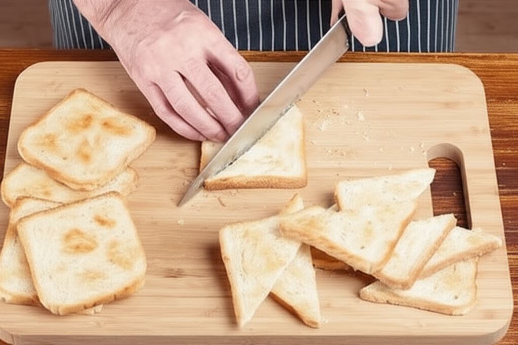 Pieczywo opiecz w tosterze lub piekarniku do złotego koloru i przekrój na skos.