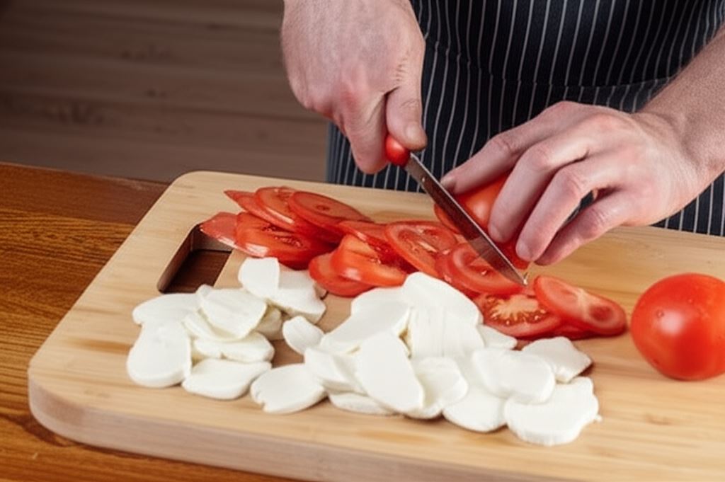 Pomidory opłucz i wraz z serem Mozzarella pokrój na plastry. Oliwki przetnij na połówki.