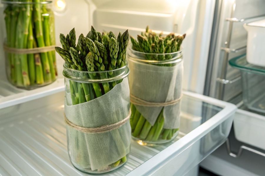 Taka metoda działa jak naturalna nawadniająca „waza” – szparagi pobierają wodę przez łodygi, pozostając jędrne i świeże nawet do 7 dni.