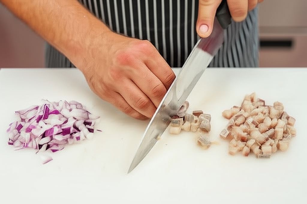 Śledzie zamocz w zimnej wodzie, wymieniając ją dwukrotnie. Potem osusz filety papierowym ręcznikiem i posiekaj w małą kostkę. Cebulę także posiekaj w małą kostkę.