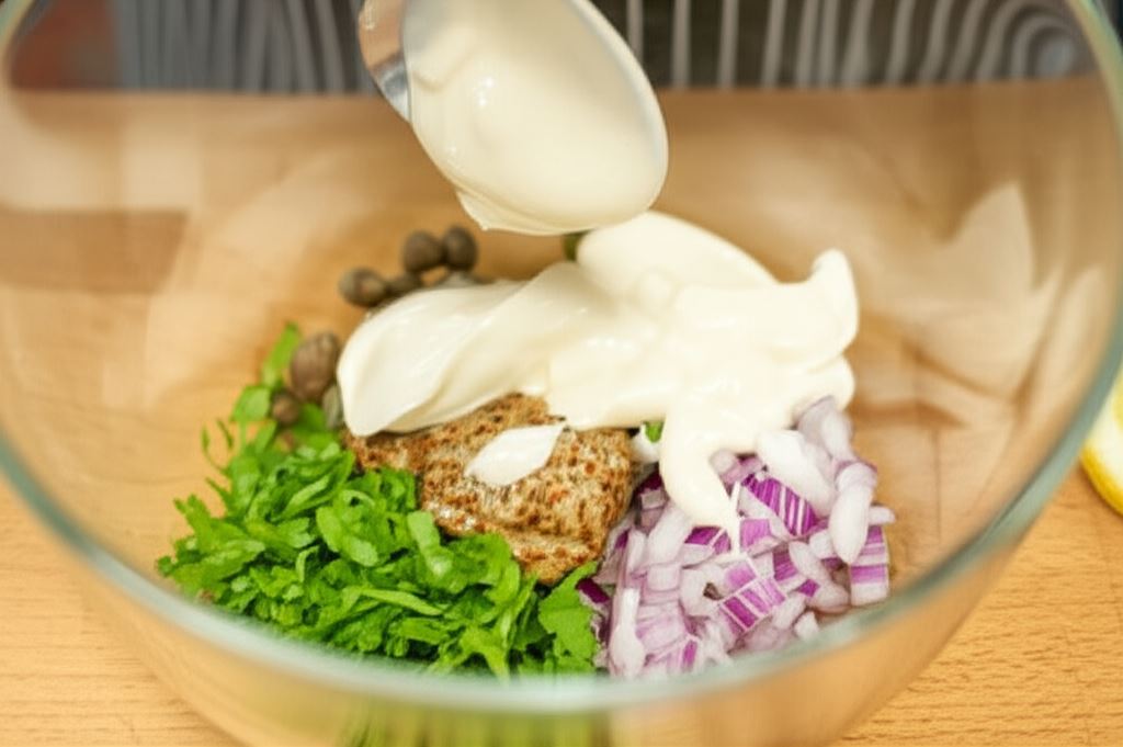 Majonez umieść w miseczce, wymieszaj z kaparami, musztardą, połową cebuli, posiekaną natką i sokiem z cytryny. Całość przypraw do smaku czarnym pieprzem i zamieszaj.