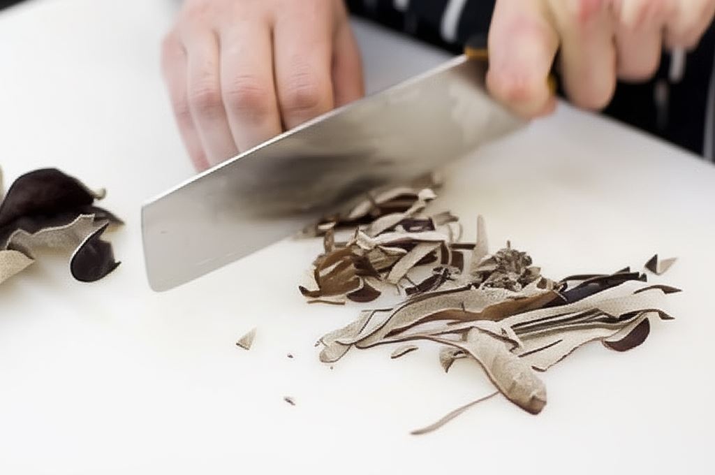 Grzyby wcześniej namocz. Kiedy zmiękną potnij w cienkie paski. Tak samo postąp z makaronem. Zalej go wrzącą wodą, a gdy zmięknie odcedź go.