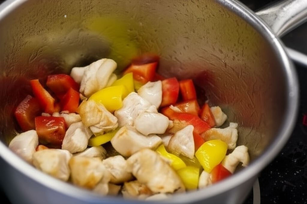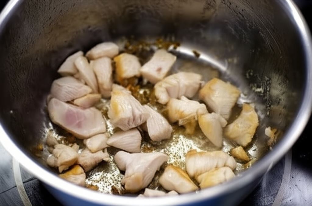 W innym garnku podsmażaj kurczaka pokrojonego na kostki.