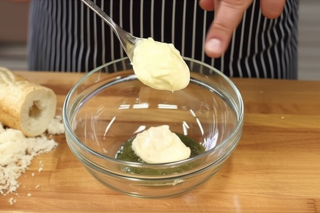 Bagietkę podziel na kawałki po 15 cm, usuń miąższ ze środka pieczywa. Pesto wymieszaj z majonezem.