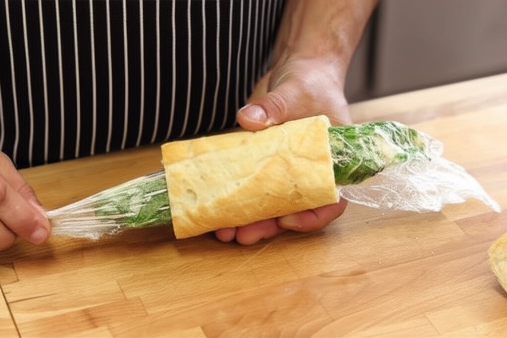 Jeden kraniec folii przeprowadź przez środek bułki i ostrożnie wciągnij farsz do wnętrza bułki. Delikatnie trzymając farsz zdejmij folię z kanapki. Bagietka nadziewana gotowa!