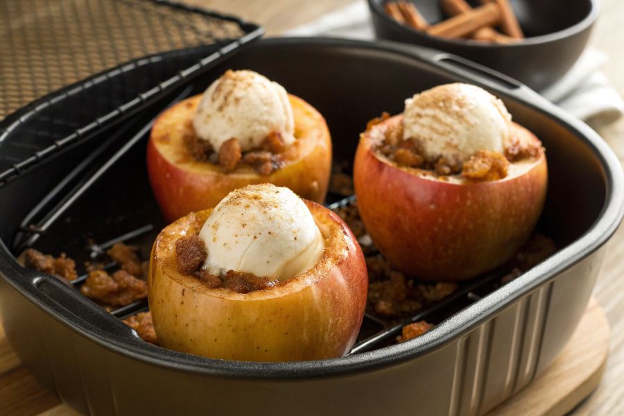 Airfryer wykorzystuje technologię gorącego powietrza, która minimalizuje potrzebę dodawania tłuszczu podczas przygotowywania pieczonych jabłek. W przeciwieństwie do tradycyjnych metod: