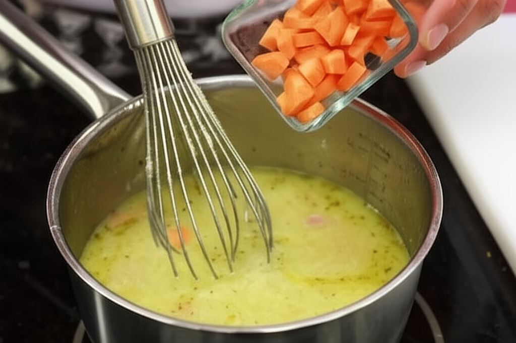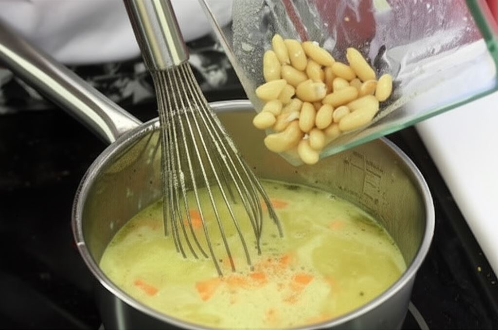 Zblenduj 1½ puszki białej fasoli, wsyp do zupy i starannie zamieszaj, następnie wsyp resztę fasoli i marchew.