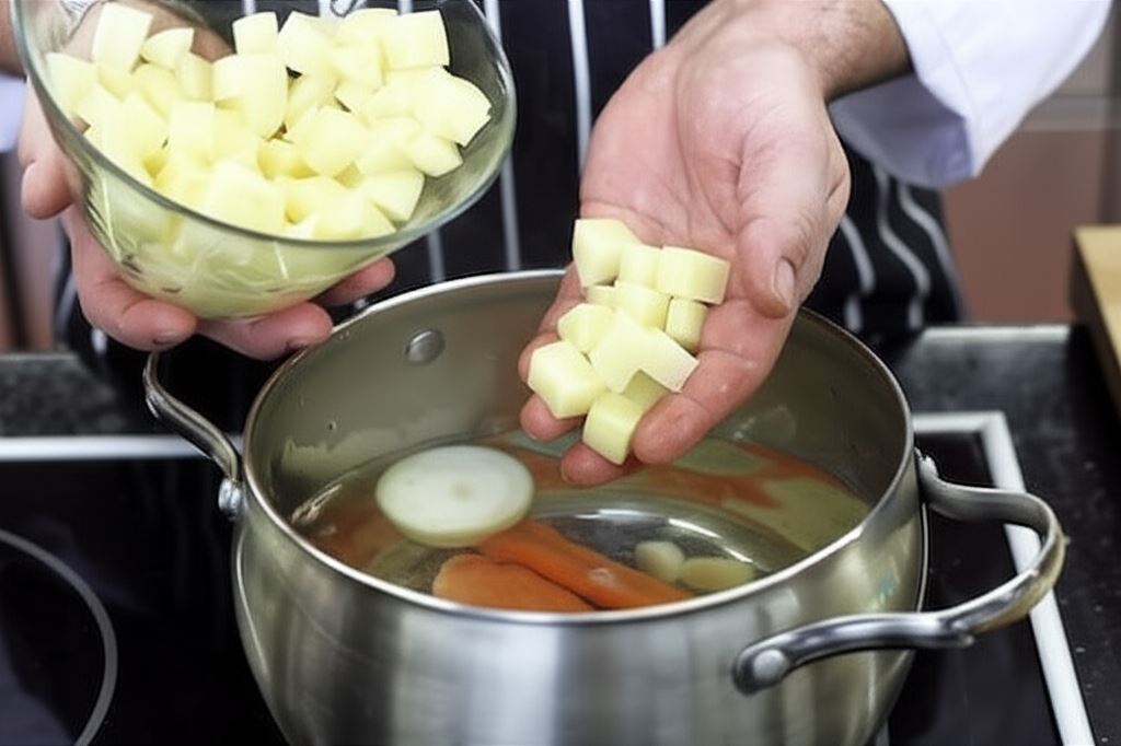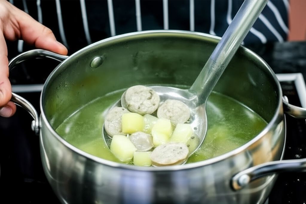 Gotuj bulion na włoszczyźnie wraz z ziemniakami pokrojonymi w kostkę, aż ziemniaki będą miękkie, po czym wyjmij włoszczyznę. Kiełbasę sparz przez minutę.