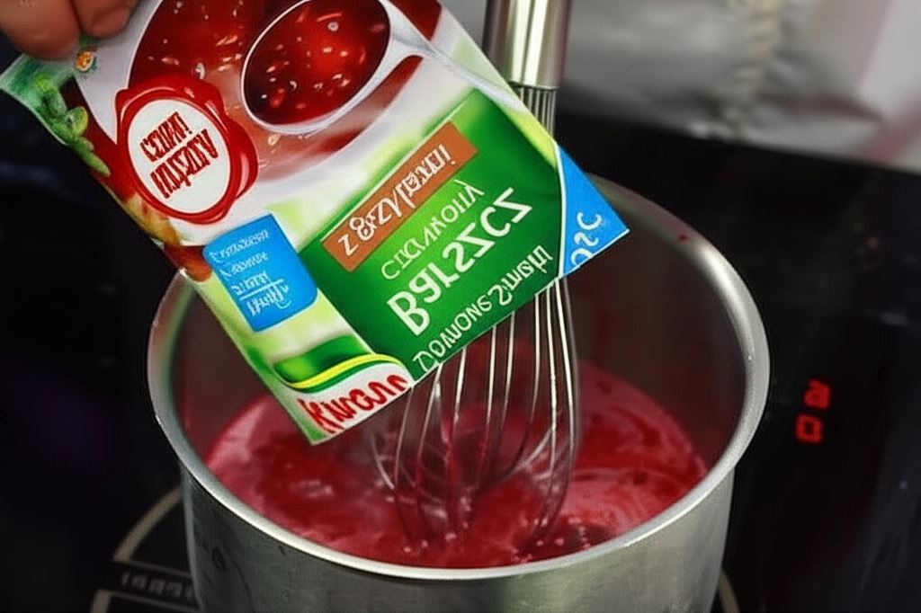 Uzupełnij wrzątkiem wodę pozostałą z gotowania grzybów do ilości 750 ml i połącz z opakowaniem Barszczu czerwonego Knorr.