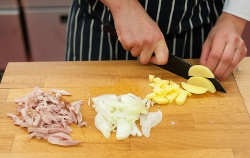 Oddziel mięso od kości. Pokrój je na drobne paski, cebulę w krążki, a ziemniaki w kostkę.