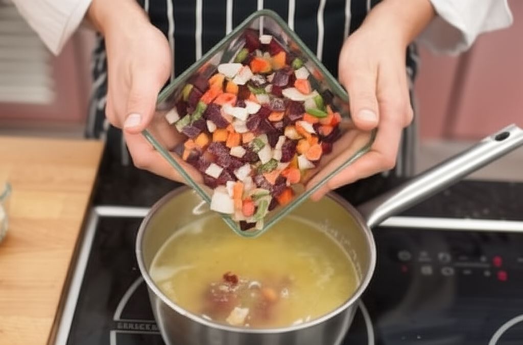 Ziemniaki obierz, potnij w kostkę, zalej 2 litrami wody i ugotuj. Wsyp kostkę rosołową Knorr oraz zamrożone warzywa. Wszystko gotuj około 10 minut. Aby zupa była bardziej pożywna, do wywaru możesz dodać pokrojoną w kostkę kiełbasę.