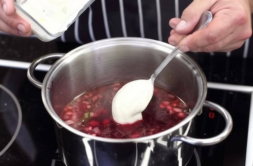 Przed serwowaniem wlej do zupy śmietanę. Barszcz przyozdób świeżo posiekanym koperkiem.