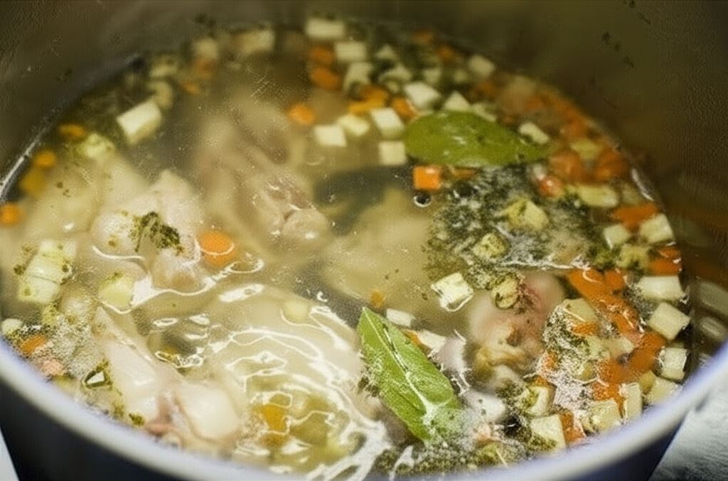 Posiekaj warzywa w kostkę, umieść w garnku. Wrzuć skrzydełka i zalej wszystko około 1 litrem zimnej wody. Potem wsyp przyprawy i ugotuj bulion na zupę.