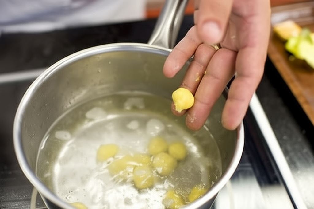 Przepuść ziemniaki przez praskę, wsyp jedno jajko, mąkę i pozostały koperek, następnie zagnieć na jednolitą masę.