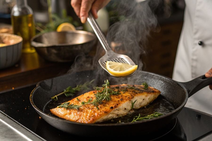 Smażenie ryby na patelni tradycyjnej wymaga odpowiedniego przygotowania powierzchni. Stalowa lub żeliwna patelnia powinna być dobrze rozgrzana przed położeniem ryby, co zapobiega przywieraniu. Kluczowy jest moment, gdy tłuszcz zaczyna delikatnie dymić – wtedy powierzchnia ryby natychmiast się zamyka, zachowując soczystość.