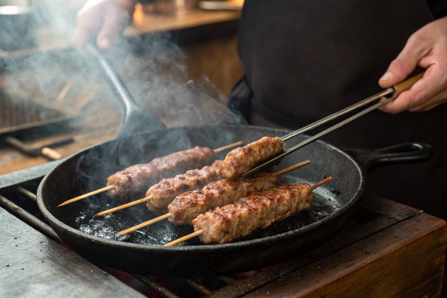 Rozgrzej patelnię grillową lub żeliwną do wysokiej temperatury (około 220-240°C). Nie dodawaj tłuszczu – mięso zawiera wystarczającą ilość. Ułóż szaszłyki i smaż przez 2-3 minuty bez poruszania, aż utworzy się charakterystyczna skórka. Następnie obróć o 90 stopni (nie przewracaj na drugą stronę!), by uzyskać wzór grillowy.