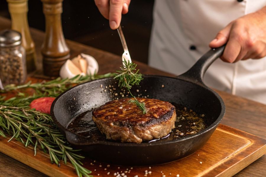 Sekret doskonałego rumsztyku tkwi w temperaturze smażenia – powinna być bardzo wysoka na początku, aby zamknąć soki w mięsie, a następnie niższa, by doprowadzić rumsztyk do pożądanego stopnia wysmażenia.