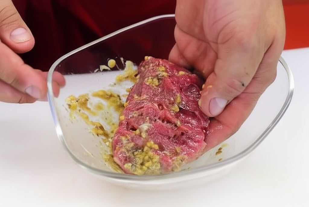 Sporządź marynatę. W moździerzu połącz sól, pieprz w ziarnach, gorczycę, czosnek oraz oliwę.