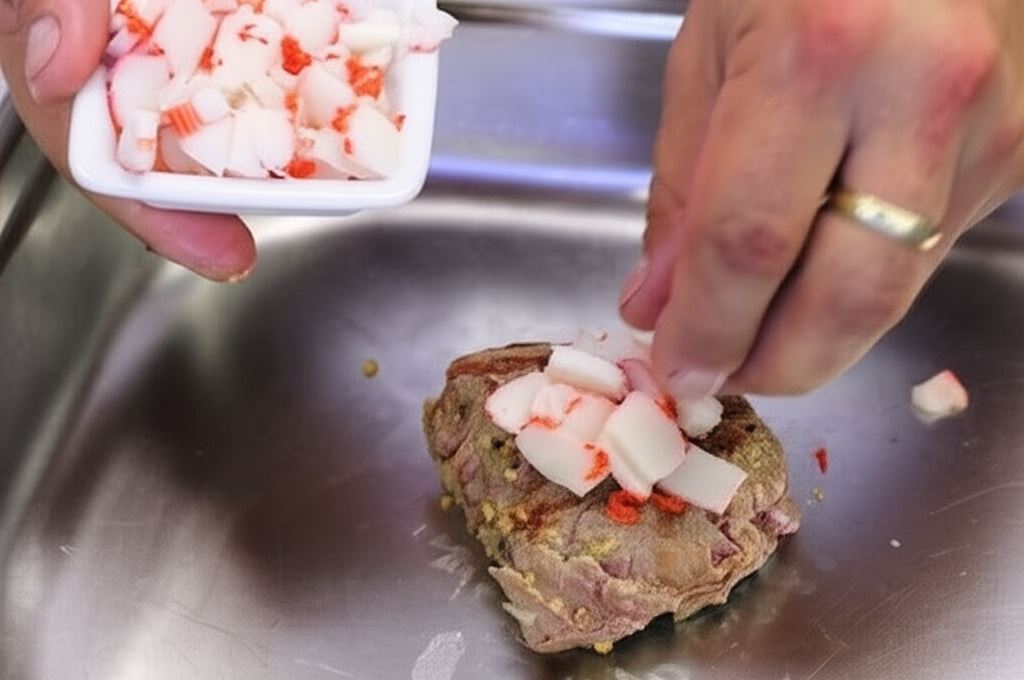 Potem na górze umieść mięso kraba. Piecz 10 minut w piekarniku rozgrzanym do temperatury 180-200 stopni.