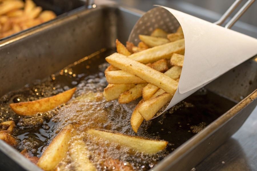 • Pierwszy etap: smażenie w temperaturze 150-160°C przez 5-7 minut – ziemniaki są gotowane, ale nie brązowieją