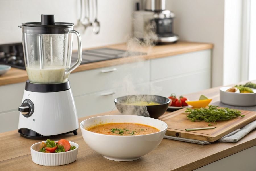 Blender z systemem zabezpieczającym przed przegrzaniem to niezbędny element wyposażenia kuchni, w której regularnie przygotowuje się zupy kremowe. Pozwala na dłuższą pracę urządzenia bez ryzyka uszkodzenia silnika.