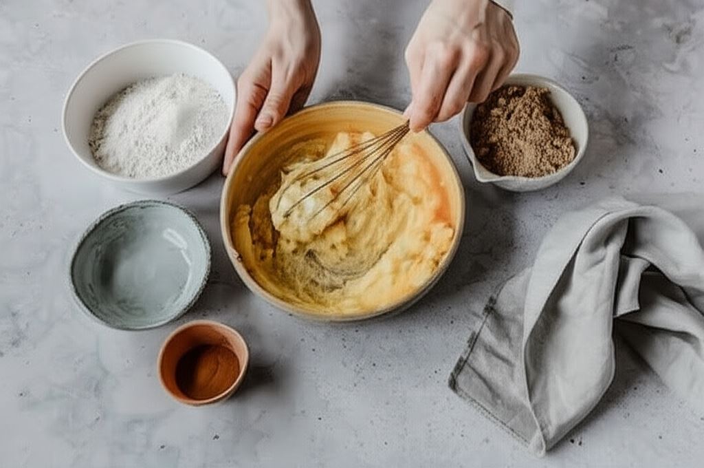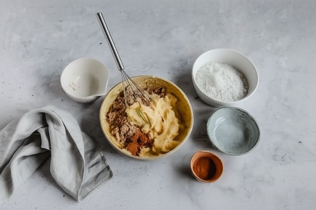 Orzechy włoskie mielemy na mąkę. Dodajemy je do masy jajecznej. Mąkę ryżową łączymy z cynamonem oraz proszkiem do pieczenia i również wsypujemy do ciasta.