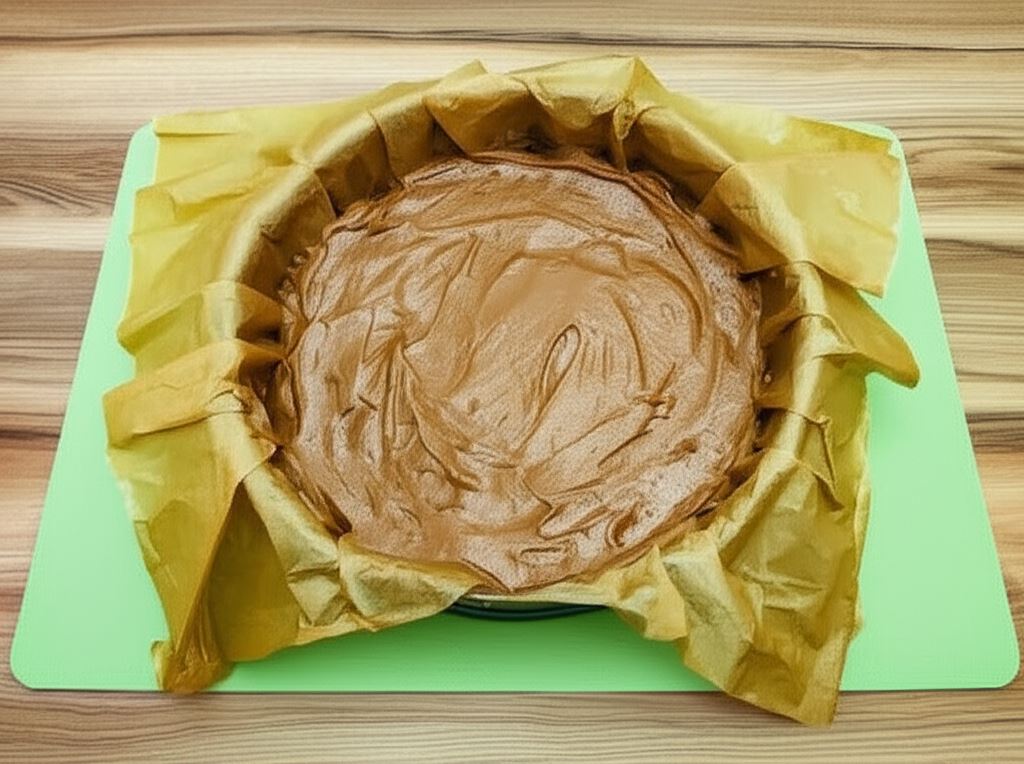 Formę tortową wysmarować masłem i wyłożyć papierem do pieczenia, włożyć do niej ciasto i umieścić w piekarniku na 40 minut. Przed wyciągnięciem sprawdzić patyczkiem czy ciasto jest upieczone. Powtórzyć procedurę z drugą częścią składników wypiekając drugi blat. Blaty ostudzić.