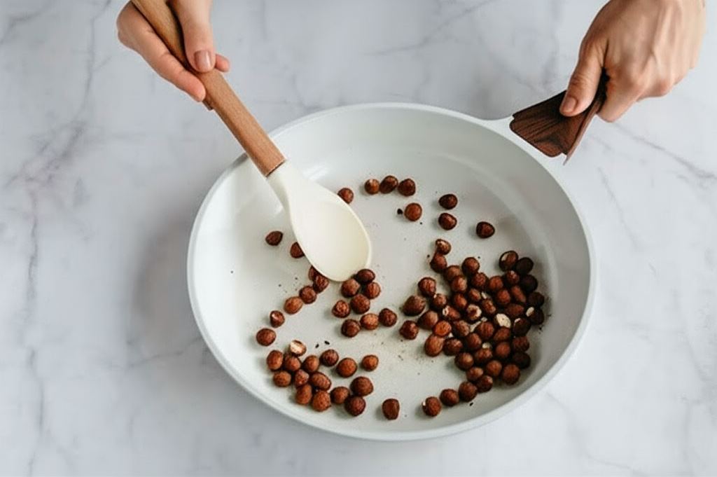Orzechy prażymy na suchej patelni. Przenosimy na ściereczkę i pocieramy wzajemnie. Skórka powinna sama odpadać.