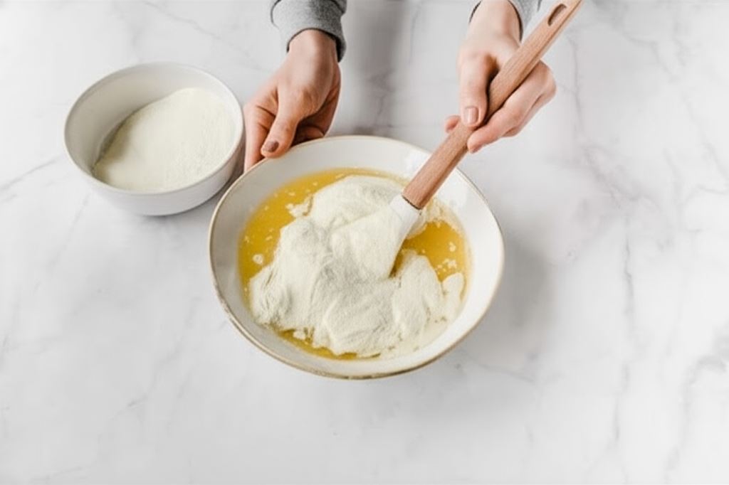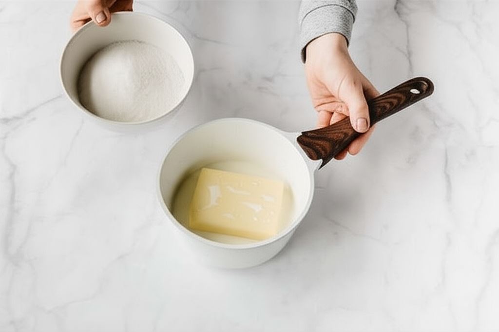 Masło, mleko i cukier wkładamy do rondelka i ogrzewamy do rozpuszczenia składników. Uzyskaną mieszankę przenosimy do miski i odstawiamy do delikatnego ostygnięcia.