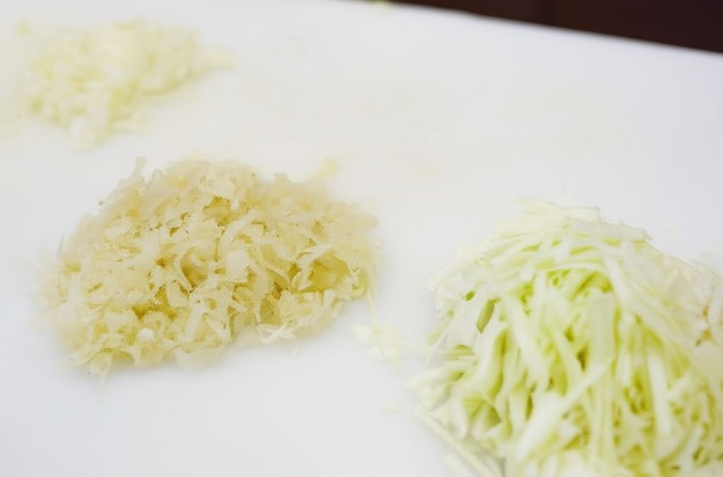 Poszatkuj kapustę białą, a kiszoną przekrój 2 razy, aby ją rozdrobnić.