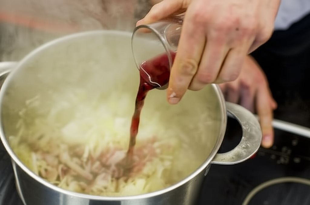 Cebulę obierz i posiekaj w kostkę, zrumień w garnku i wsyp kapusty. Zalej winem, wrzuć liść laurowy i ziele angielskie.