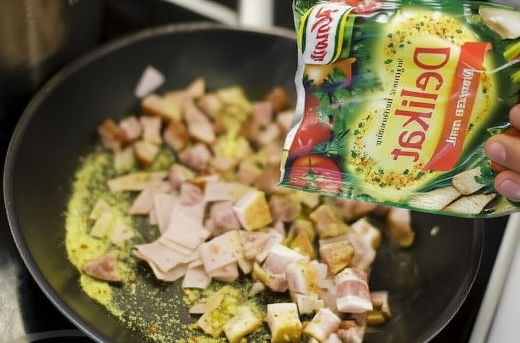 Boczek, szynkę i kiełbasę pokrój w kosteczki. Zrumień na patelni, delikatnie oprószając przyprawą Delikat Knorr.