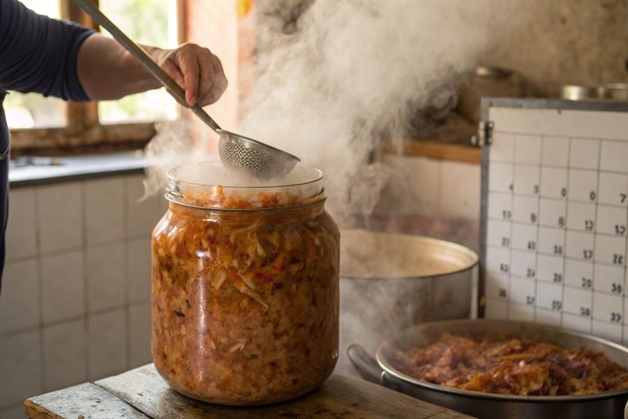 Wskazówka bezpieczeństwa: Zawsze podgrzewaj bigos do temperatury minimum 75°C przed spożyciem, nawet jeśli słoik został niedawno otwarty. Wysoka temperatura eliminuje potencjalne patogeny.
