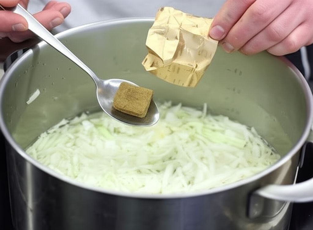 Poszatkowaną kapustę zalej wodą i wsyp Kostkę Knorr. Duś przez parę minut.