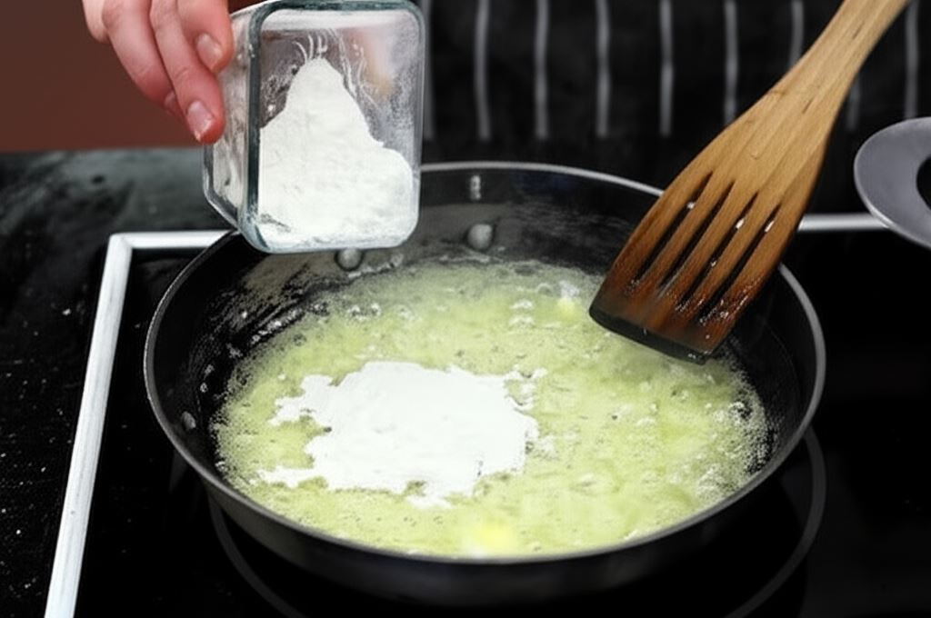 Cebulę posiekaj w kostkę, zrumień, wsyp mąkę i zalej wywarem z kapusty.