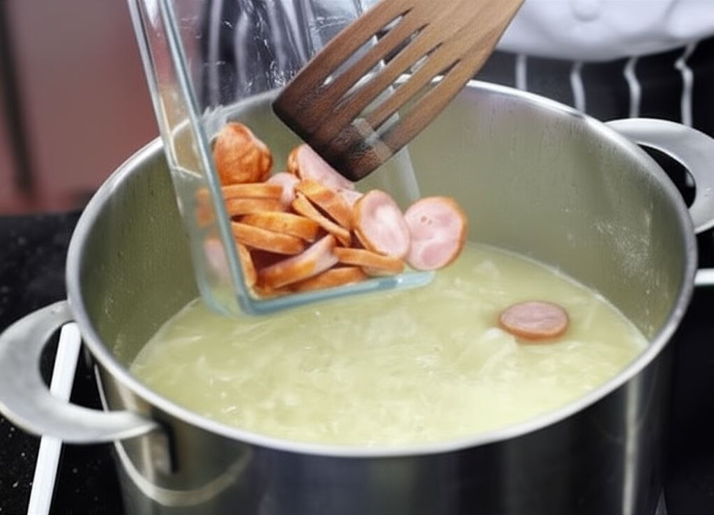 Wrzuć do kapusty razem z pokrojoną na plastry kiełbasą.