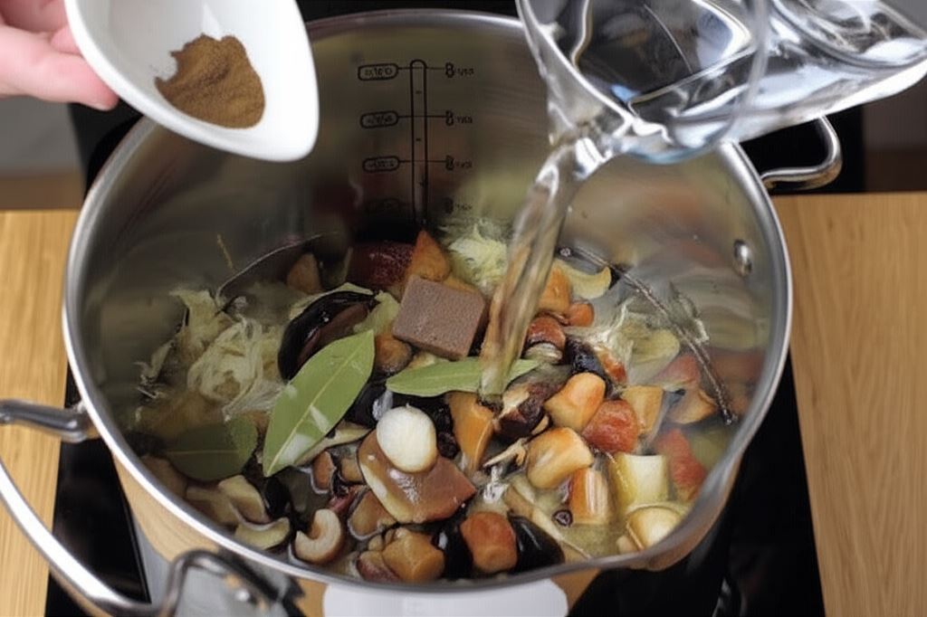 Kapustę i grzyby umieść w garnku, zalej wodą tak by przykryła kapustę, wsyp bulion grzybowy, liść laurowy, ziele angielskie, nasiona jałowca i gotuj pod pokrywką do miękkości około 1h.