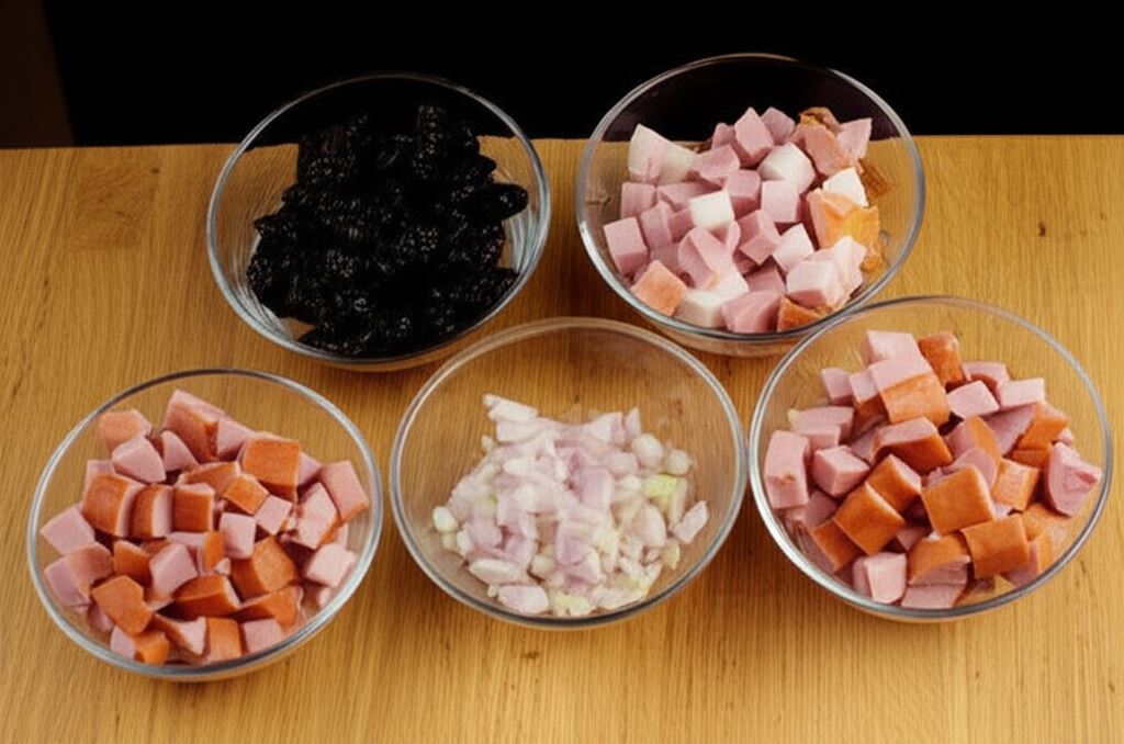 Kiełbasę i boczek potnij na większe kawałki, natomiast śliwki i szalotkę na drobniejsze.