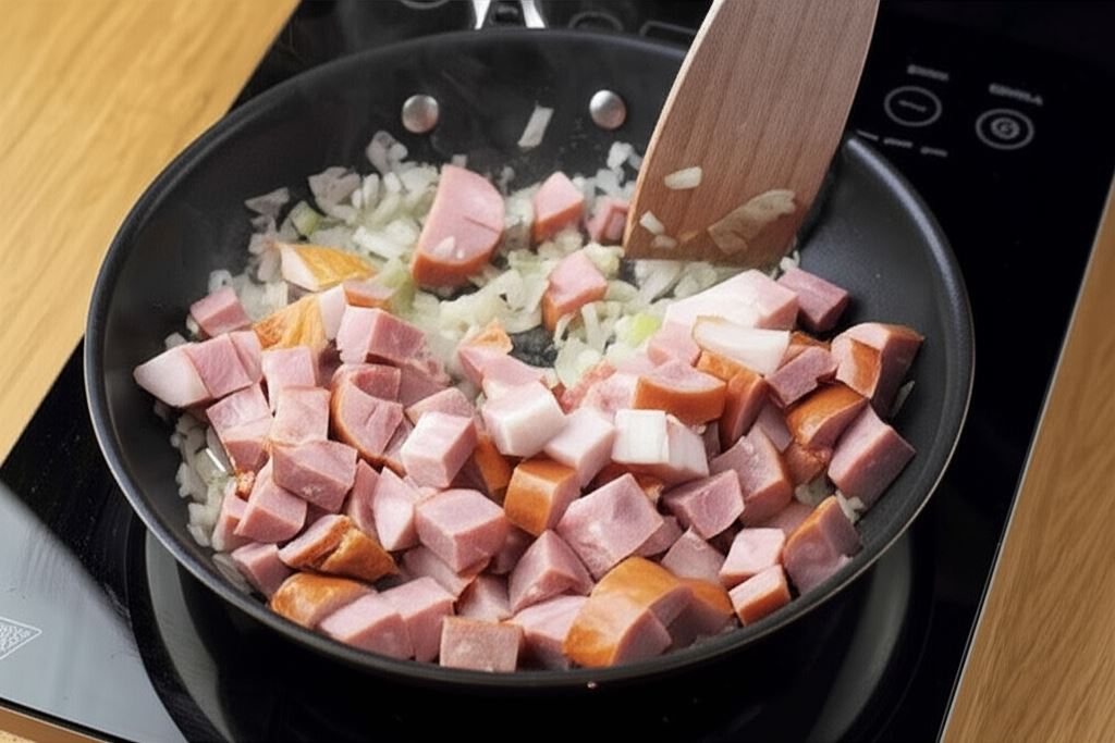 Rozgrzej olej na patelni i podsmaż kiełbasę, boczek oraz szalotkę.