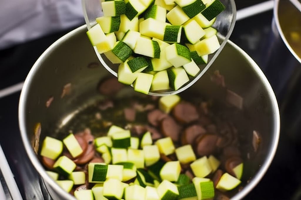 Przyrumień na smalcu pokrojony w kostkę boczek, dodaj plastry kiełbasy oraz cukinię. Smaż przez około 5 minut.