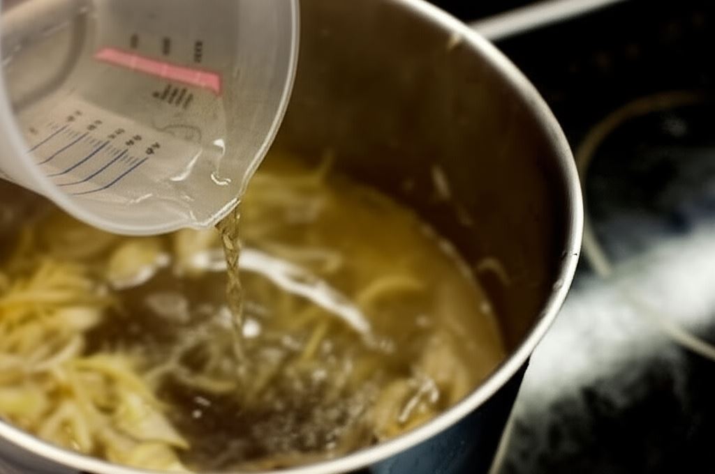 Cebulę posiekaj w piórka i podsmaż w garnku. Wsyp 1 łyżkę mąki, zamieszaj, a potem dodaj listek, ziele i wlej 1 l gotującej wody.