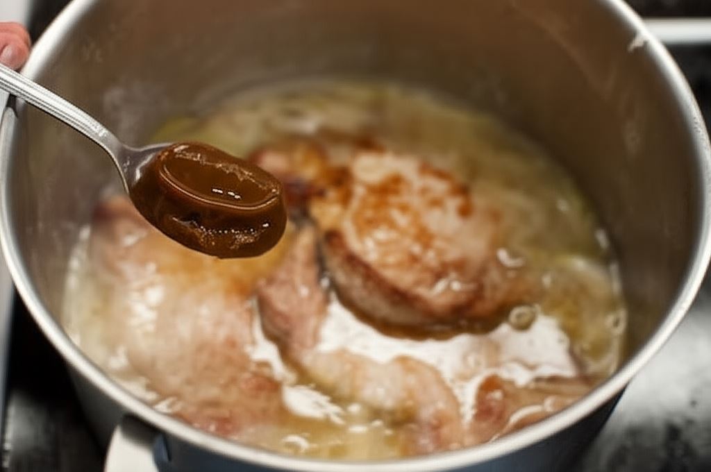 Wrzuć podsmażone kotlety oraz Kostka do mięs pieczeniowa Knorr, która uwydatni smak potrawy. Zredukuj ogień i duś aż mięso stanie się miękkie.